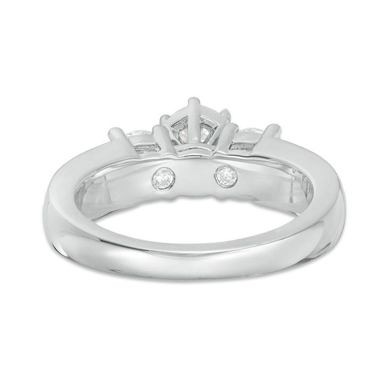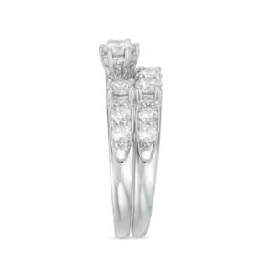 On the day you ask for her hand in marriage, honor her with a three stone diamond bridal set that honours love. Exquisite in 14K white gold, the engagement ring dazzles with three round diamonds as its focus.And two small round diamonds complete the look. On your wedding day, complete the ensemble with the coordinating wedding band, which also features three round diamonds flanked by round stones set into the shank.t.w. of diamonds and a polished shine.